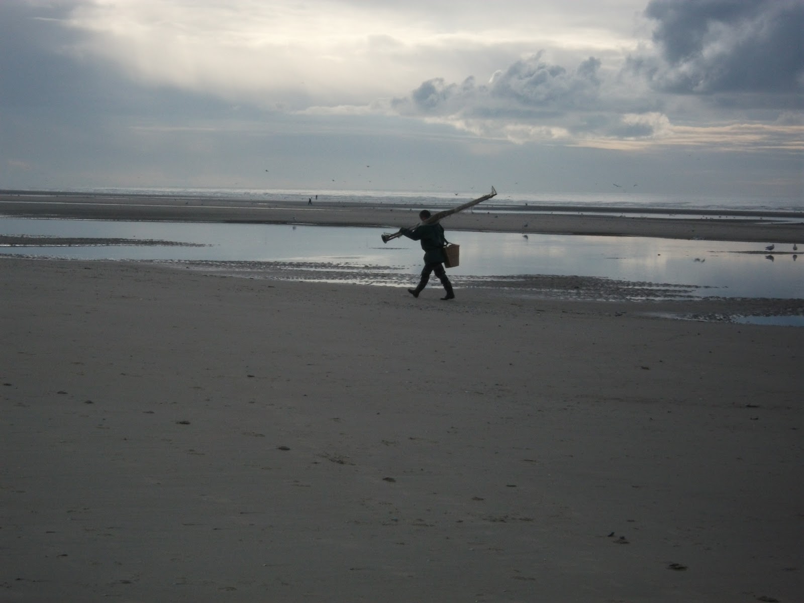 LA MER REMONTE , LES OISEAUX VOLENT, TOURNENT, CRIENT, LA NOURRITURE APPROCHE... LA PECHE A ETE BONNE , IL FAUT RENTRER LES NUAGES MENACENT, LE HAVENEAU SUR L`EPAULE, VERS LE RESULTAT DE LA PECHE DES CREVETTES GRISES, DEUX, QUATRE,CINQ Kilos.... IL VA PLEUVOIR !!! acteon.
