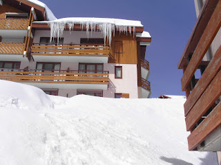 TERRASSE  DANS  LA NEIGE ,  SKIS PLANTES  DANS  LA NEIGE ..